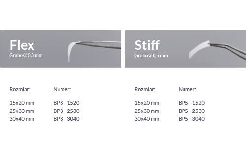 • Występuje w dwóch wariantach: Flex – o wysokiej elastyczności, zapewniająca łatwe dopasowanie do powierzchni ubytku, oraz Stiff – zaprojektowana z myślą o skutecznym utrzymaniu przestrzeni regeneracyjnej.